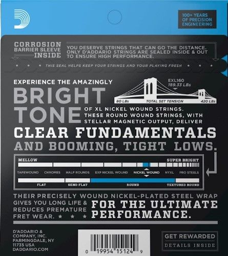 EXL160, D’Addario’s top-selling heavy bass string set, provides the ideal combination of strong overall fundamentals with distinctive brightness and booming, tight lows. Fits basses with a string scale length of up to 36 1/4 inches and a good choice for players looking to down tune.