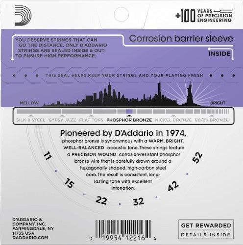 Phosphor Bronze was introduced to string making by D'Addario in 1974 and has become synonymous with warm, bright, and well balanced acoustic tone. D'Addario Phosphor Bronze strings are precision wound with corrosion resistant phosphor bronze onto a carefully drawn, hexagonally shaped, high carbon steel core. The result is long lasting, bright sounding tone with excellent intonation.