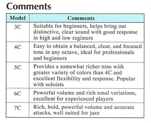 The mouthpieces are numbered : 3C, 4C, 5C, 6C, 7C ; This allows you to identify the best one for your use. See the photo chart for the technical differences.