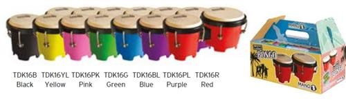 MANO PERCUSSION - Tunable mini bongos. Durable plastic 4 1/2" & 5" coloured shells with in-built feet and natural hide heads. Black comfort curve rims and tension rods. Comes with tuning key. Coloured carry box.