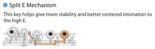 The split E mechanism is designed to make the high E more responsive. This mechanism physically splits the double G keys. When playing G, the keys behave as normal, closing both of the G keys. When fingering high E, the mechanism closes the lower of the two G keys