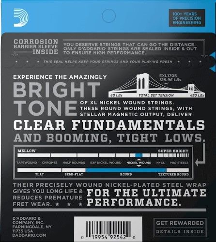 D'Addario XL Nickel Wound Electric Bass strings are world-renowned as "The Player's Choice" amongst bass players of all genres and styles. All XL strings are precision wound on our exclusive digitally-controlled machines, ensuring each string has excellent intonation, clear fundamentals, and unparalleled consistency. Each string is wound with a nickelplated steel wrap wire known for distinctive bright tone with excellent magnetic output delivering a universally appealing and versatile tone for all playing styles.
