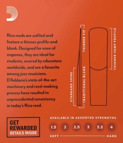 Rico by D'Addario Alto Saxophone reeds are crafted with beginners and educators in mind, thanks to their traditional blank and profile for ease of response, plus unfiled cut for added support. These reeds are available for a full range of clarinets and saxophones to best suit your playing needs.