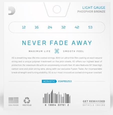 D'Addario XS Acoustic Phosphor Bronze strings combine their most popular acoustic alloy with their most advanced string coating technology, resulting in clear tone, smooth feel, and superior tuning stability – all with the longest possible string life. With its ultra-thin film coating on every wound string and a unique polymer treatment on the plain steels, XS offers our highest level of protection for maximum life. XS also features NY Steel high carbon core and plain string wire, and our exclusive Fusion Twist, for incomparable break strength and tuning stability. XS is the most innovative coated string D`Addario have ever created. Never Fade Away!
