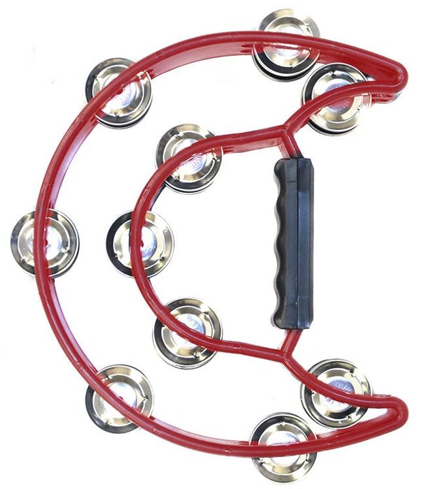 This Percussion Plus hand percussion sound effect is a PVC shell half moon tambourine in red and has 10-Double rows of jingles. Enjoy making beautiful music with Percussion Plus.