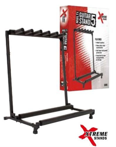 XTREME - GS805 Multi guitar stand. Heavy duty square section tubular steel frame. Folds up for easy transportation and storage. Extra thick EVA foam rubber protection for neck and body. Holds 5 guitars (mixed acoustic and electric).