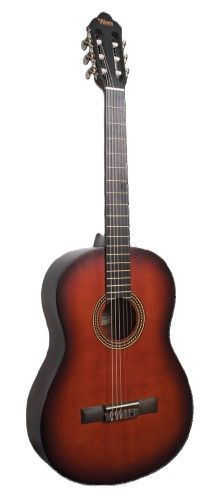 VC204HCSB VALENCIA - 4/4 size “Hybrid” classical guitar. A thin neck model featuring a 45mm neck width (at nut). For superior stability and strength of the neck, this model features two central reinforcing teak strips installed along the entire neck length. CLASSIC SUNBURST