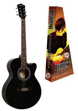 REDDING RGC51CEBK Grand Concert electric/acoustic. Venetian cutaway. Spruce top. Basswood back and sides. Cream bound catalpa neck with rosewood fingerboard and pearl dot inlays. Cream bound body. Triple ring herringbone rosette. Rosewood bridge with compensated saddle. Chrome diecast machine heads. Redding 3 band EQ preamp with LCD chromatic tuner. Rotary volume, low, middle and high controls. Phase shift and tuner switches. Low battery LED. 9 volt battery. Piezo under-saddle pickup. Supplied with UPlay Guitar Guide and free online lessons. Full colour display box. RGC51CEBK REDDING - black.