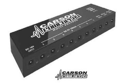 DCPS10 CARSON POWERPLAY - Multi power supply. Features ten filtered outputs for reduced hum and noise: 7 x 9v DC (100mA), 1 x 9v DC (500mA), 1 x 12v DC (100mA) and 1 x 18v DC (100mA) each with status LED and overload/short circuit protection. Supplied with Carson 18v AC adaptor and 10 x DC connector cables.