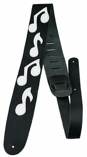 This is a 2.5" guitar strap that has "White Music Notes" sewn onto black soft leather. It is adjustable from 44.5" to 53" in length.