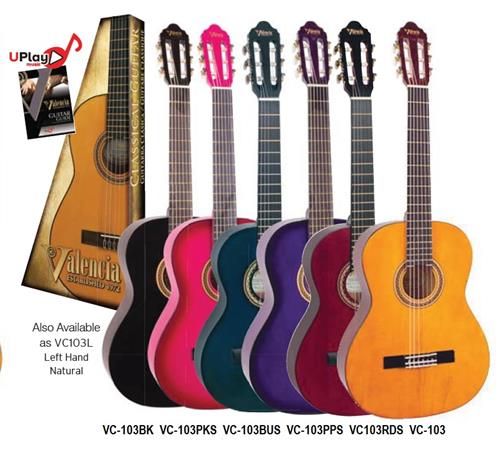 VC103BK VALENCIA -3/4 size classical guitar. Linden top, back and sides. ABS black bound body and fingerboard. Nato neck with ebonized maple fingerboard and bridge. Veneered headstock. Nickel machine heads with white buttons. Supplied with Valencia UPlay Guitar Guide and free online lessons. Full colour display box. BLACK