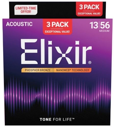 Elixir 16546 Nanoweb Phosphor Bronze 13-56 3 Pack Medium Acoustic Guitar Strings