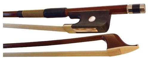 Octagonal Brazil wood stick, half lined ebony frog, pearl eye, silver plated winding with horse hair bow.
