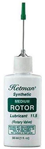 Rotor Lubricants: Hetman Synthetic Rotor Lubricants provide for long-lasting rotary valve performance. These lubricants will protect rotors and valve casings against corrosion and wear while improving valve seal. Hetman Synthetic Rotor Lubricants will not swell rubber bumpers or damage plastic components. The 22 ml long-tipped precision needle oiler facilitates application through the slide tubes. Available in two nontoxic, non-gumming viscosity grades.