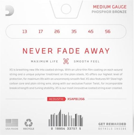 D'Addario XS Acoustic Phosphor Bronze strings combine our most popular acoustic alloy with our most advanced string coating technology, resulting in clear tone, smooth feel, and superior tuning stability – all with the longest possible string life. With its ultra-thin film coating on every wound string and a unique polymer treatment on the plain steels, XS offers our highest level of protection for maximum life. XS also features NY Steel high carbon core and plain string wire, and our exclusive Fusion Twist, for incomparable break strength and tuning stability. XS is the most innovative coated string we’ve ever created. Never Fade Away!