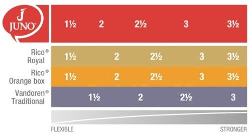 It’s easy to find a Juno reed that feels good to you – and makes you sound good too. If your’re just starting out, you may want to choose a 1 1/2 strength reed that’s more flexible and easier to play. As you get better, you may find that a stronger 3 strength reed gives you a heavier, fuller sound.