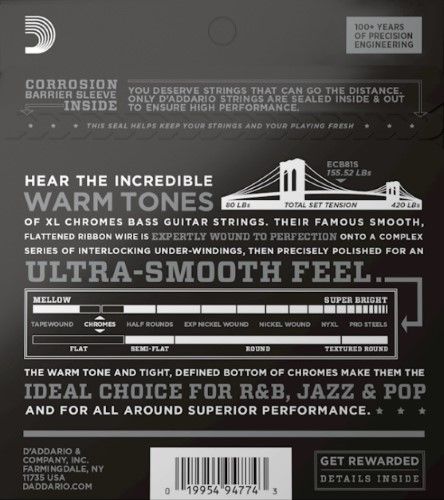 XL Chromes are among the warmest, mellowest bass strings we have to offer. These flat wound strings provide an ultra-smooth feel and a dark, yet warm tone, while allowing movement across the fretboard with no finger noise. Made with a high carbon steel core, Chromes stainless steel flattened ribbon wrap wire is expertly wound onto a series of interlocking under-windings, then precisely polished for unparalleled smoothness and a tonal presence which blends beautifully into the mix. This 45-100 Regular Light set is a short scale version of our best-selling bass gauge, known for its even tension, bright tone, and tight low-end.