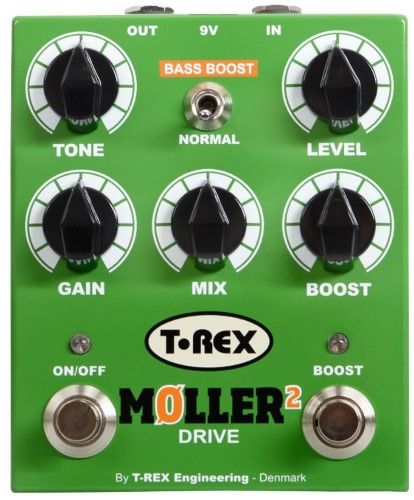 T-Rex Møller 2 delivers the same classic overdrive that made it's predecessor one of T-Rex’s most sought-after pedals. Named after Danish guitarist Knud Møller, for whom the original pedal was designed, Møller 2 features a more durable “Bass Boost” toggle switch and easier-to-read control knob graphics. The pedal is armed with a 0-20 db clean boost, as well as a mix control which lets you dial in the perfect balance between distorted and clean signals. Rolled all the way up and with distortion maxed, the pedal sounds just like a vintage tube amp at full volume. Roll the Mix knob back a bit, and your clean signal starts to get through; if you pick lightly or roll back your guitar volume, you get a stunning clean, softly-clipping sound that retains all the feel and dynamics of your original tone, only bigger, louder and richer. The boost function lets you dial in a solo level, whether the overdrive circuit is activated or not.