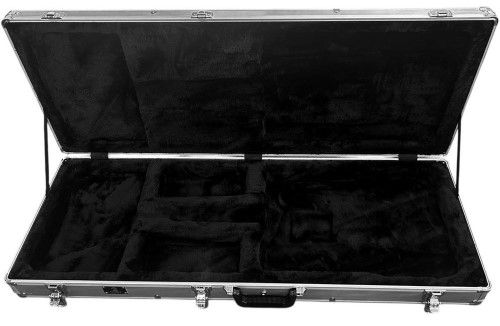 This deluxe EPS molded electric guitar case is made from the finest eco-friendly aluminum with an ultra-strong extruded tongue-and-groove aluminum valance. The interior is created from EPS foam giving ultimate support, then covered in plush to completely protect your electric guitar from scratches and nicks. It has an interior accessory space for storage and includes 1 lockable latch in the middle of 3 riveted latches. The rubber feet provide stability while the convenient offset handles provide easier transportation.