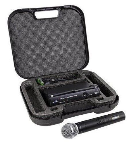 UHF receiver with hand-held microphone. Simply plug the receiver into a P.A. or amplifier and you are good to go. Great for weddings, conferences, church services and more. Includes DC power adapter, all connecting cables and ABS foam padded carry case.