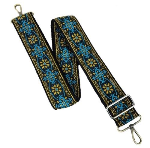 LBJ3 XTR - Vintage Series Banjo Strap. Perfect for the banjo player who wants that old school retro look. 2 inch cotton jacquard strap with poly web backing. Strong metal slider adjustment. Blue and gold.