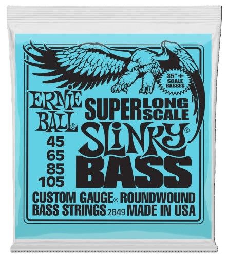 Ernie Ball Nickel Wound Super Long Scale Electric Bass Strings are made from nickel plated steel wrapped around a hex shaped steel core wire. Each bass guitar string produces a bright, balanced tone. Designed to fit 35" scale basses, the string length is 50" with a taper at 38 1/2". Gauges .045, .065, .085 .105