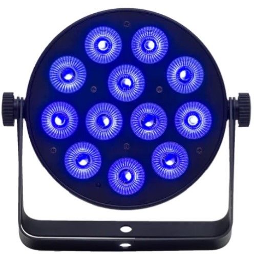 The PAR12X12L is a 12x 12W LED RGBWAU Parcan with IR Remote