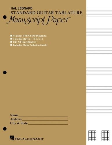 With six 6-line staves and 8 blank chord diagrams printed on each of the 64 pages this is the perfect manuscript for guitarists. Will suit all ring binders. Tan Cover. Stiched.