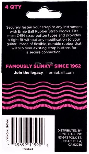 Securely fasten your strap to any instrument with Ernie Ball rubber strapblocks. Fits most strap button types and provides a tight fit without any modification to your guitar. Made of flexible, durable rubber that will slip over existing strap buttons for a secure connection.