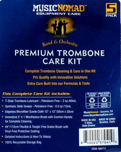Music Nomad has set a new higher standard for what you should expect when you buy a trombone cleaning & care kit. Each product is so well thought out that you will appreciate each feature & benefit it will bring you & your trombone. It starts with their innovative cleaning tool designs (2 'n 1 Mouthpiece & Cup Brush, Premium Vinyl free Snake Brush, Edge-less Microfiber Cloth). No detail was overlooked, from the high quality material specifications to the ergonomic handles. Our Made in USA T-Slide Trombone Lubricant & Tuning Slide Grease formulations are scientifically designed for long lasting performance for beginners, pros or repair techs.
