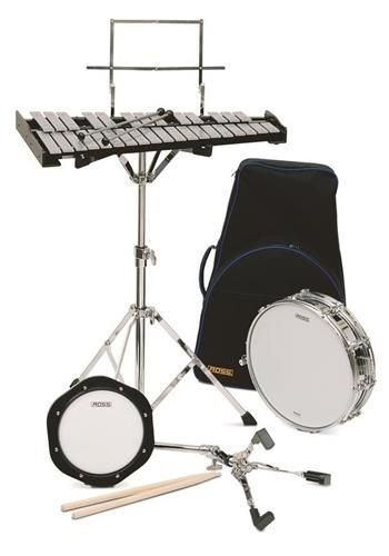 Backpack Snare Drum/Bell, Percussion Kit, Easy Roll Cart, 32-note keyboard Glockenspiel with 1” wide steel tone bars, 14” x 3” ten lug chrome snare drum, 8” tunable practice pad, adjustable stand removable stand, 2B sticks, mallets.