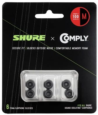 Replacement Comply (100-Series) foam sleeves for Shure Sound Isolating™ Earphones. Soft memory foam tips block out noise and make listening more comfortable, stable and immersive. Set of 6 (3-pair).