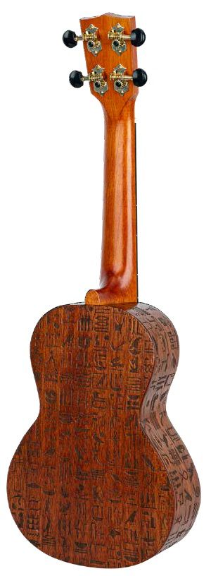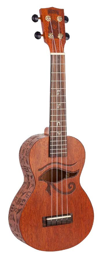 MA2PH MAHALO - Artist Elite Series. Concert Ukulele. Nato body with laser etched Hieroglyphics on back and side and arched back. Unique Eye of Ra soundhole design. Mahogany neck. Amara ebony fingerboard with detailed Egyptian number pearloid inlays and Amara ebony bridge. Gold geared machine heads with black buttons. Graph Tech Canada, NuBone XB compensated saddle. Aquila Super Nylgut strings. 16 Nickel frets. 379mm scale.
