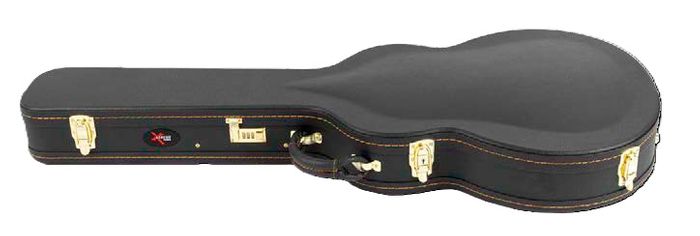 XC749 XTREME - Semi-Acoustic (335) shaped. Heavy duty plywood covered in black vinyl with orange stitching . Arched top. Thick foam interior padding. Black plush lined with fitted black protective internal blanket. Covered accessory compartment. Ergonomic imitation leather handle. 5 deluxe gold drawbolt latches and combination lock. Lock can be set to any 3 digit number. Xtreme logo plate.