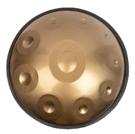 MPC55G MANO PERCUSSION - ManoPan - 10 Note Handpan. Hand crafted 22" stainless steel construction in D Kurd tuning - A3, Bb3, D4, F4, A4, C5, G4, E4, C4 and D3 Ding note. Designed with a "Gu" sound hole on the under side to enhance resonance and warmth.